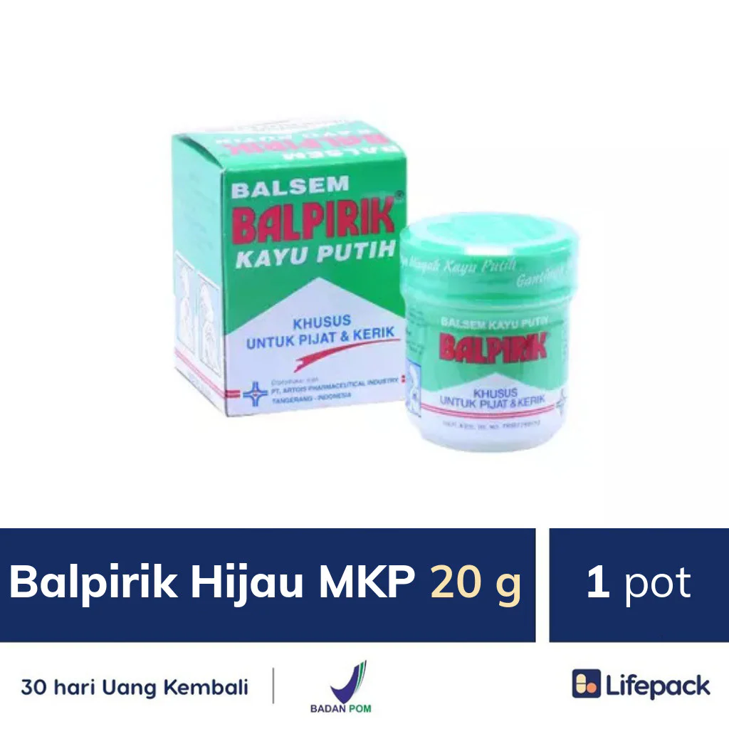 Balpirik hijau minyak kayu putih 20 gram adalah balsem yang digunakan untuk membantu meredakan nyeri otot, pegal-pegal, keseleo, sakit punggung, sakit kepala dan masuk angin. Obat ini mengandung bahan aktif oleum cajuputi, oleum eucalypti, oleum myristicae, menthol, turpentine dan vaselin album. Obat ini dikemas dalam bentuk pot dengan isi 20 gram.