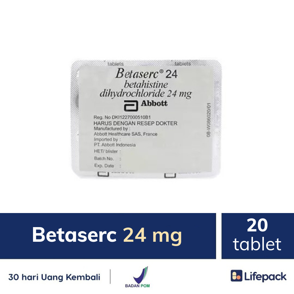 BETASERC 8 MG TABLET merupakan obat dengan kandungan Betahistine Mesylate 6 mg per tablet. Betahistine adalah suatu analog histamin dan dapat mengurangi tekanan endolimfatik dengan cara memperbaiki mikrosirkulasi. Obat ini digunakan untuk mengobati vertigo, tinitus dan gangguan pendengaran yang terkait dengan penyakit meniere. Dalam penggunaan obat ini HARUS SESUAI DENGAN PETUNJUK DOKTER.