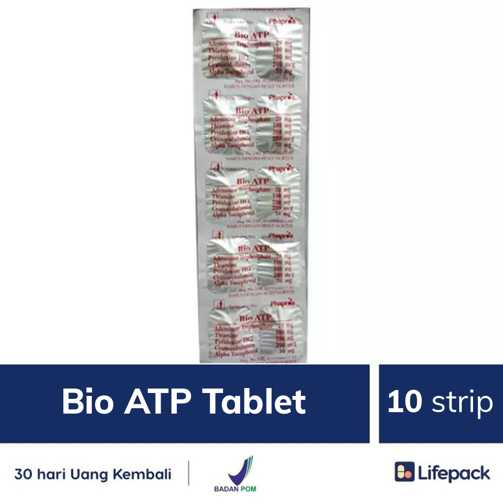 BIO ATP mengandung ATP / Adenosin Triphosphate 20mg, Thiamin 100mg, Pyridoxine 200mg, Cyanobalamin 200mcg, dan juga Vitamin e 30mg. Adenosina trifosfat (ATP) merupakan jenis nukleotida yang di sebut sebagai ?satuan molekular? pertukaran energi intraselular, maksudnya adalah, ATP ini di pakai untuk menyimpan dan mentranspor energi kimia yang ada di dalam sel. ATP juga mempunyai peran yang penting di dalam sintesis asam nukleat. Pada tumbuhan, molekul ATP juga di pakai untuk menyerap energi yang bersumber oleh tumbuhan dalam respirasi seluler nya. Dalam penggunaan obat ini harus SESUAI DENGAN PETUNJUK DOKTER.