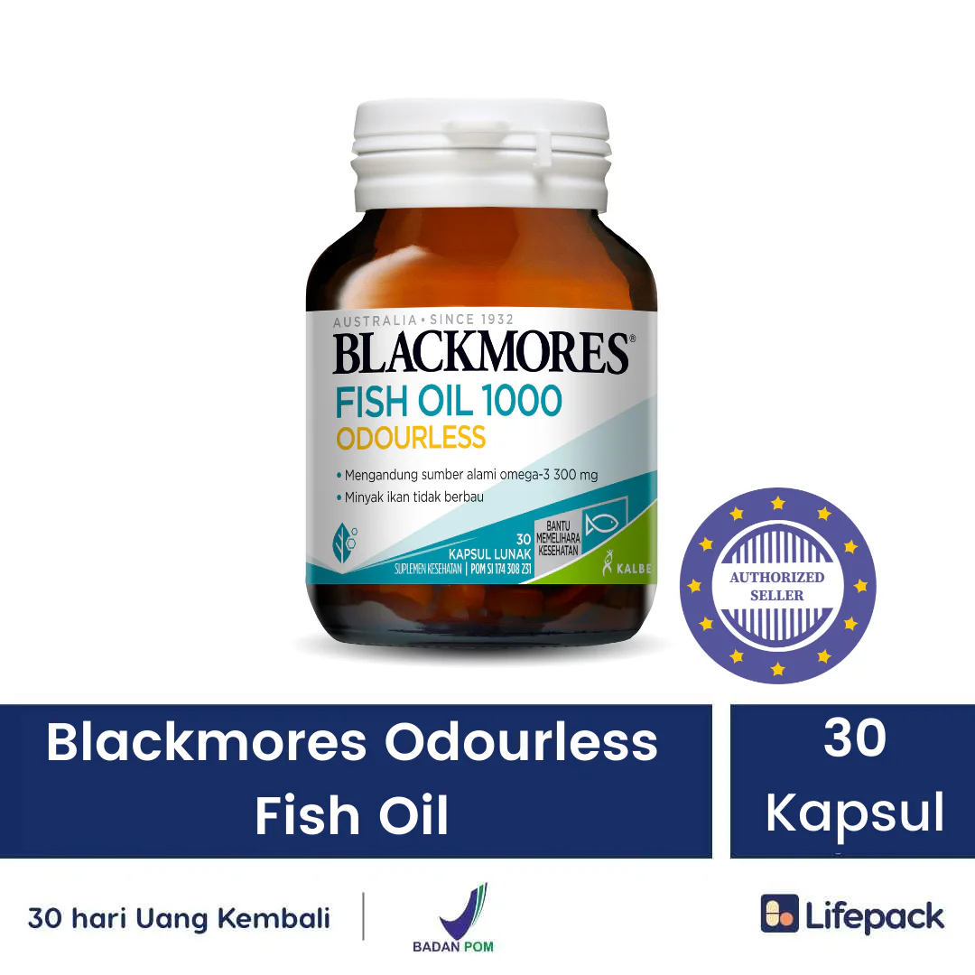 ✅ Hemat ⚠️ Hati-hati dengan barang palsu! ⚠️ Blackmores Ultimate Omega Odourless merupakan suplemen dengan kandungan minyak ikan yang diperoleh dari ikan laut asli. Kandungan utama omega-3-nya bantu menjaga kesehatan jantung dan kardiovaskular. Disertai juga dengan kandungan Eicosapentaenoic acid (EPA) dan Docosahexaenoic acid (DHA) yang bantu pelihara fungsi normal mata dan otak. Varian Omega Odourless telah diformulasikan dengan kandungan vanilla sehingga tidak meninggalkan bau amis. Komposisi: Fish oil (natural) 1 g (1000 mg) mengandung: Omega-3 300 mg, Eicosapentaenoic acid (EPA) 180 mg, Docosahexaenoic acid (DHA) 120 mg Dosis: 1 Kapsul/Dosis Aturan Pakai: Setelah makan Kontra Indikasi: Hati-hati mengkonsumsi produk dengan kandungan EPA lebih tinggi dari DHA bersamaan dengan obat anti koagulan, dapat meningkatkan efek pengenceran darah. Jika akan menjalani operasi, komunikasikan dengan dokter mengenai penggunaan suplemen ini. Nomor Izin Edar: SI214344171 Tanggal Kedaluwarsa: 29/03/2025 Perhatian: ▪️ Simpan dalam wadah kering yang tertutup pada suhu ruangan dan terhindar dari sinar matahari langsung. ▪️ Mohon konfirmasi masa berlaku produk (expiry date) ke tim Customer Service (CS) kami melalui chat ▪️ Untuk informasi, konsultasikan melalui chat""