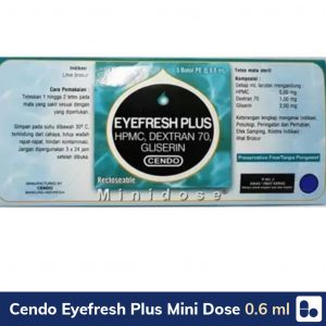 CENDO EYEFRESH PLUS MINIDOSE 0.6 ML mengandung zat aktif HPMC dan Dextran. Tetes mata ini digunakan untuk mengatasi iritasi pada mata yang kering karena kekurangan seksresi air mata, melindungi mata terhadap iritasi lebih lanjut, mengurangi rasa tidak nyaman karena iritasi mata ringan, terkena angin dan sinar matahari.