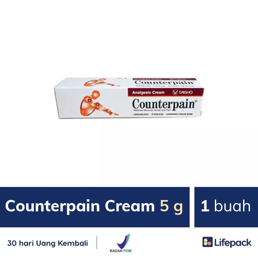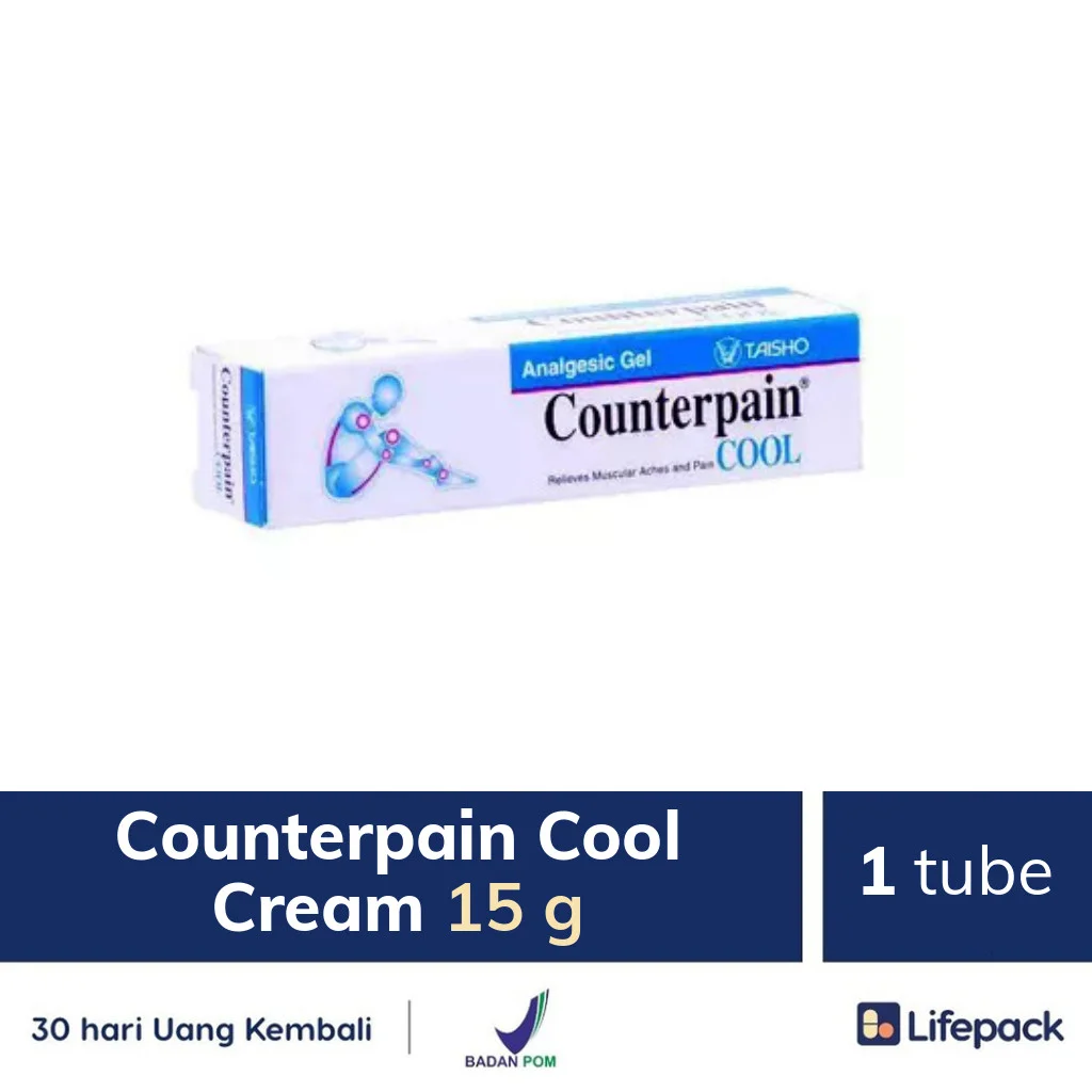 Counterpain Cool CR 15 gram adalah obat yang digunakan untuk meredakan nyeri otot dan sendi akibat terkilir, keseleo, pegal-pegal dan cedera akibat olahraga. Salah satu cara mengatasi nyeri otot dan sendi adalah dengan memberikan sensasi dingin. Obat pereda nyeri otot dan sendi ini dapat membantu memberikan sensasi dingin pada bagian tubuh yang sakit. Produk Counterpain Cool Cream hanya untuk pemakaian luar dan tidak untuk pemakaian dalam.
