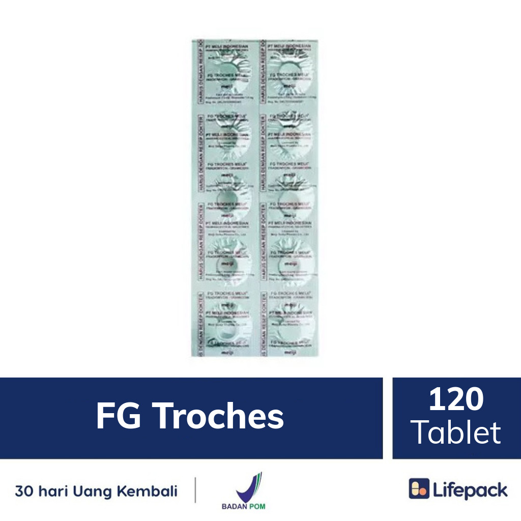 Sakit radang tenggorokan merupakan kondisi saat terjadi iritasi tenggorokan dan rasa nyeri ketika menelan maupun tidak, dan sering disertai dengan gejala flu. Radang tenggorokan disebabkan oleh infeksi bakteri maupun hal-hal di luar penyakit seperti makanan panas, mulut yang kering, atau terlalu banyak berbicara. FG Troches adalah tablet hisap yang bekerja sebagai antibiotik untuk melawan infeksi akibat bakteri pada rongga mulut. Obat ini mengandung Fradiomycin Sulfate dan Gramicidin-S HC__l. Antibiotik Troches mudah dikonsumsi saat sakit tenggorokan karena hadir dalam bentuk tablet hisap dengan rasa yang manis.