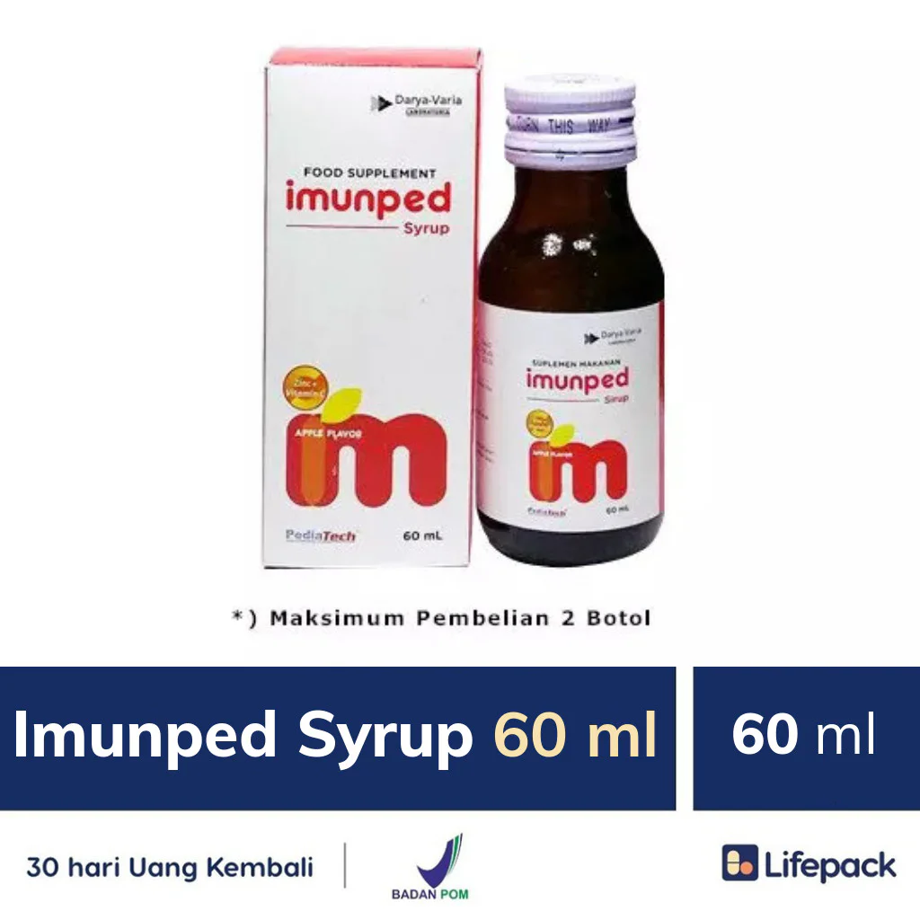 IMUNPED SIRUP merupakan suplemen yang mengandung vitamin c dan zinc sulfat. Suplemen ini digunakan untuk membantu memelihara kesehatan tubuh pada anak.
