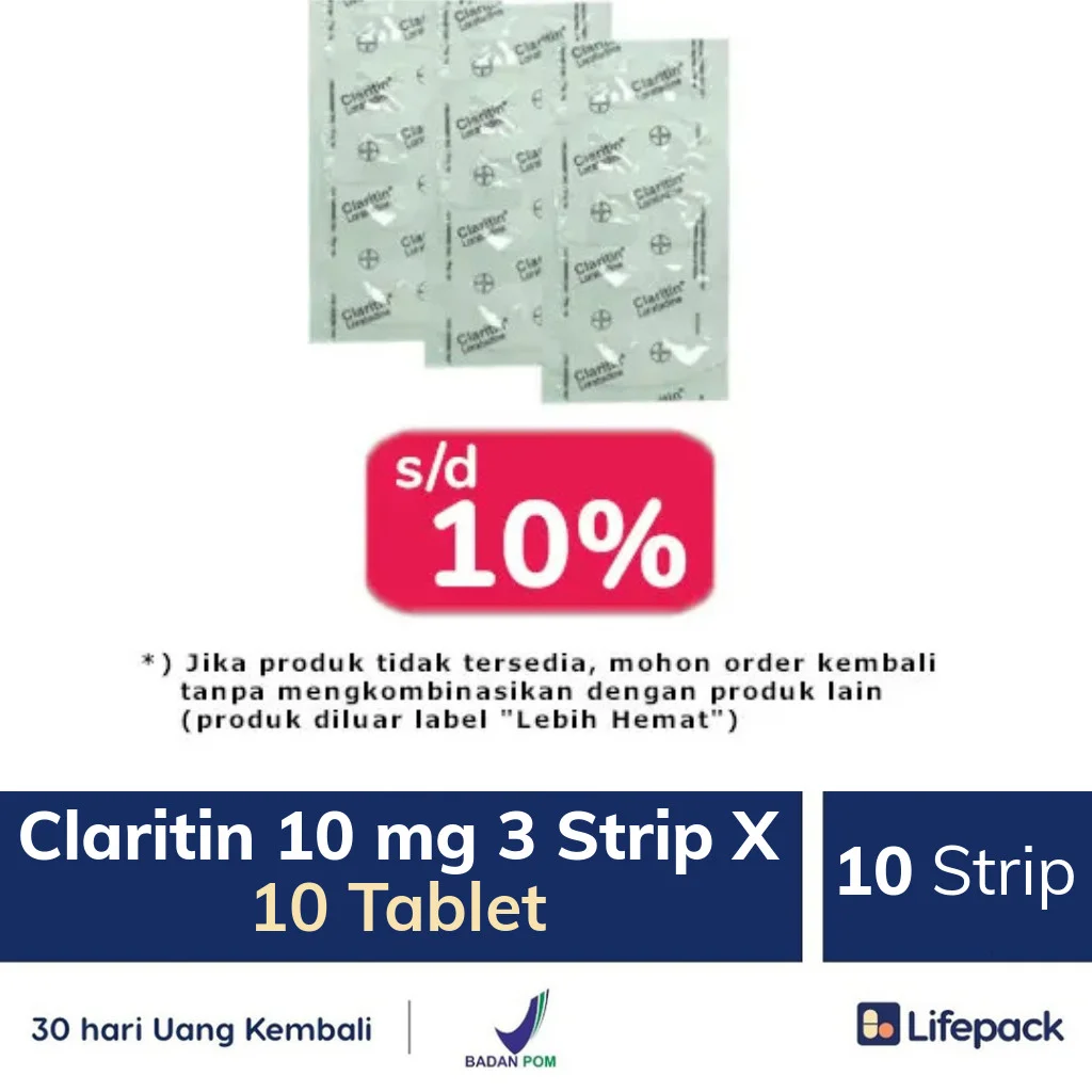 Hingga saat ini alergi belum bisa disembuhkan secara sempurna. Penderita alergi hanya dapat menghindari alergen atau penyebab dari timbulnya alergi tersebut. Penyebab alergi bisa sangat bervariatif mulai dari makanan tertentu, suhu dingin, debu, dan lain sebagainya. Untuk meredakan gejala alergi ringan, kamu bisa mengonsumsi Loratadine 10mg. Loratadine obat untuk meredakan berbagai reaksi alergi ringan seperti ruam-ruam yang muncul di kulit, bersin-bersin, mata dan hidung berair dan gatal-gatal. Jika dibandingkan dengan obat anti alergi lainnya, obat ini termasuk yang memiliki efek samping paling ringan. Loratadine juga aman dikonsumsi anak di atas 2 tahun, selama mengikuti petunjuk dari dokter.