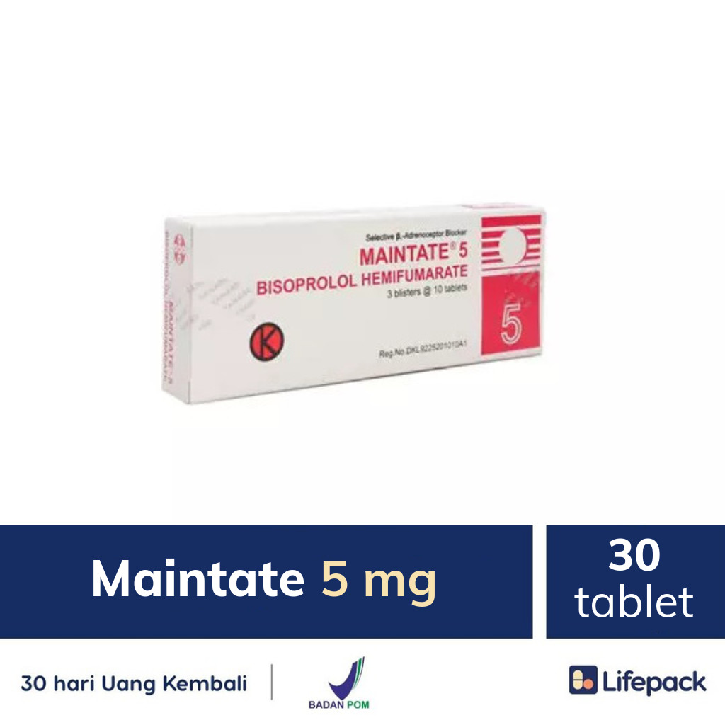 Maintate adalah obat yang bermanfaat untuk mengontrol tekanan darah. Obat ini diformulasi khusus bagi pasien terindikasi hipertensi. Kandungan Bisoprolol Fumarate pada obat ini bekerja dengan menurunkan kecepatan denyut jantung. Penggunaan obat ini harus sesuai dengan petunjuk dokter. Beli obat di Lifepack dijamin asli.