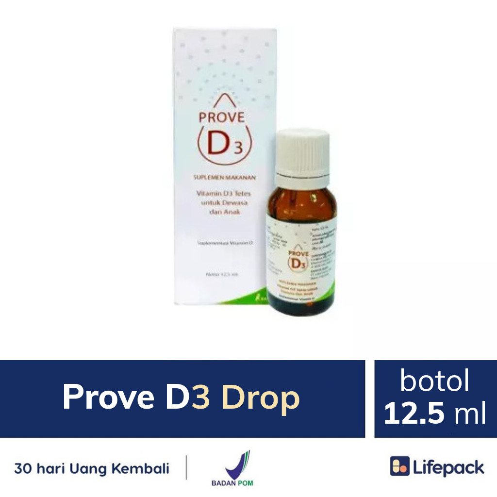 PROVE D3 DROPS merupakan suplemen vitamin D3 (cholecalciferol) yang termasuk dalam golongan vitamin D dan analog. Suplemen ini digunakan untuk suplementasi vitamin D. Setelah diabsorpsi, akan dibawa ke hati untuk dimetabolisme menjadi 25(OH)D, kemudian 25(OH)D akan dibawa ke ginjal untuk dimetabolisme menjadi calcitriol.