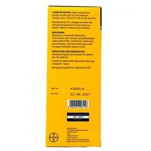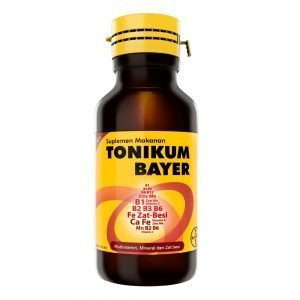 | Komposisi | Setiap 5 ml Tonikum Bayer mengandung Vitamin B1 15 mg, Vitamin B2 2.25 mg, Vitamin B3 2.25 mg, Vitamin B6 3 mg, Vitamin B12 12 mcg, Vitamin C 150 mg, Ferro Gluconate 20 mg, Calcium Gluconate 100 mg, Mangan Sulfate 2 mg, dan Zinc Sulfate 5 mg. |